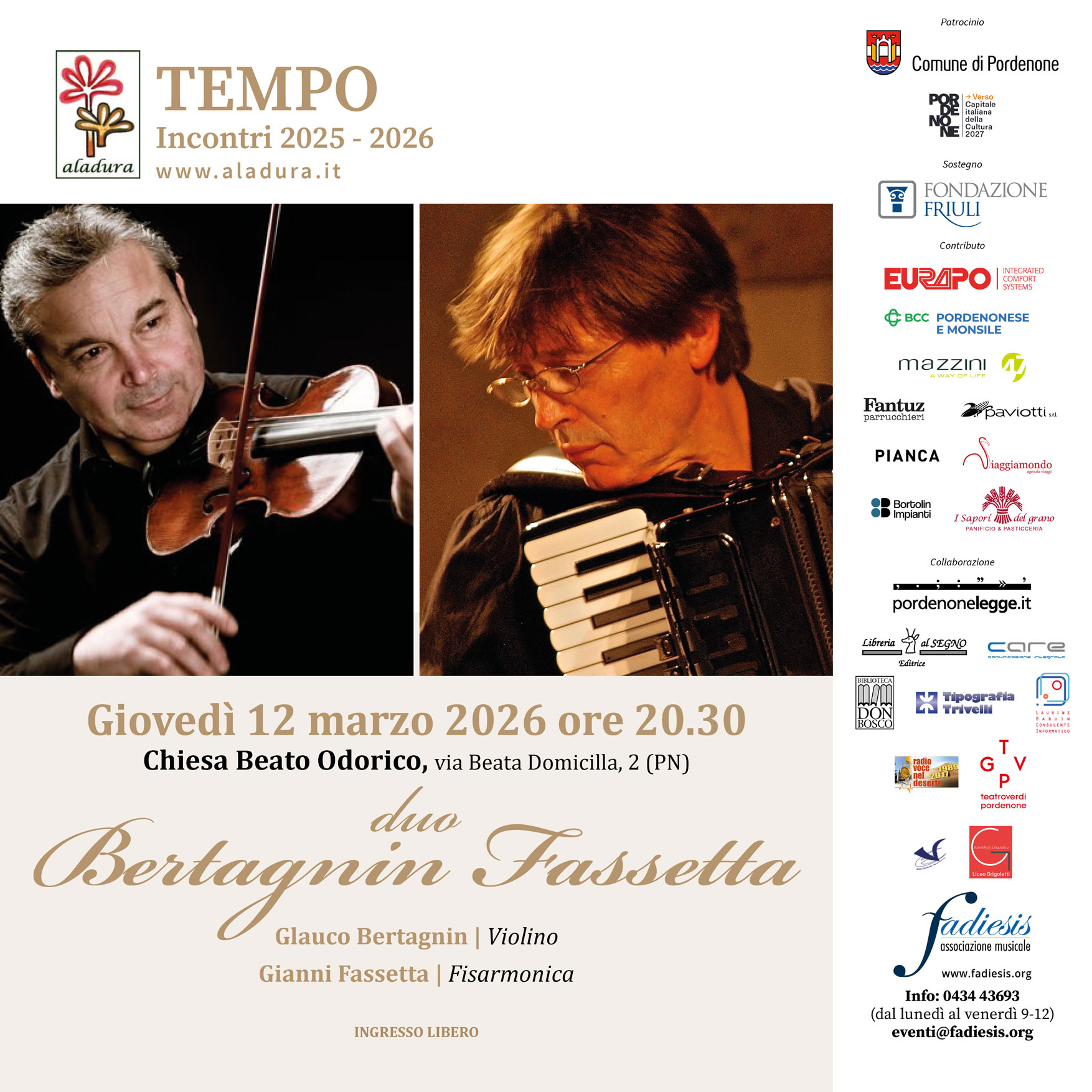 Sul palcoscenico due maestri di fama internazionale, Glauco Bertagnin al violino e Gianni Fassetta alla fisarmonica, con un programma variegato e accattivante che spazia dal repertorio classico alla musica da film, passando per le sonorità e i ritmi seducenti del tango. Non mancate!