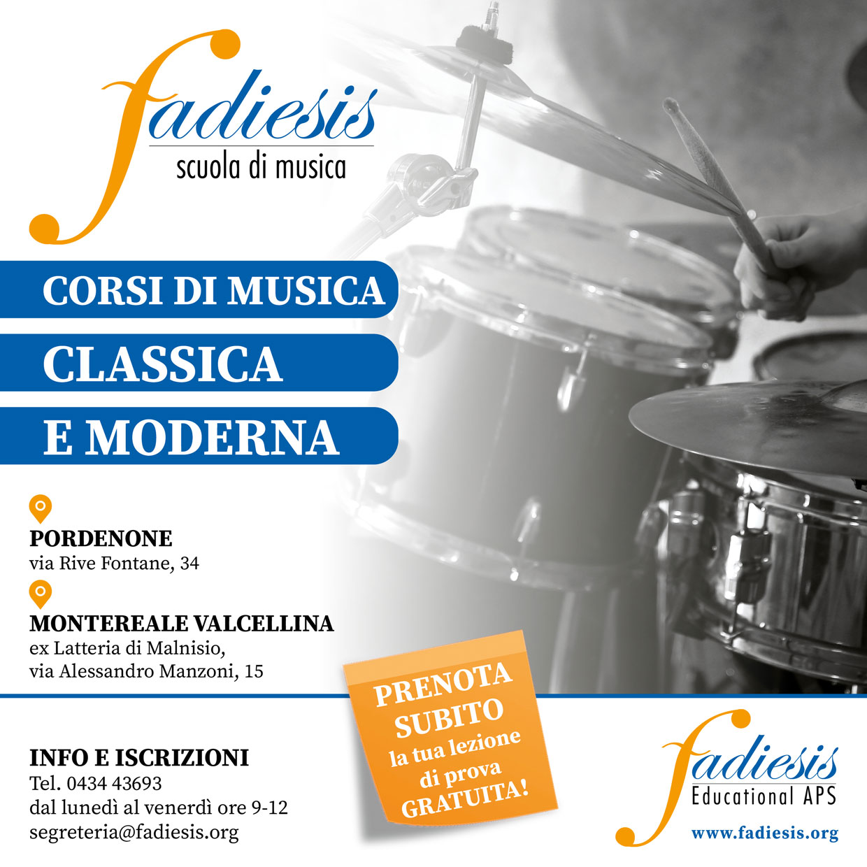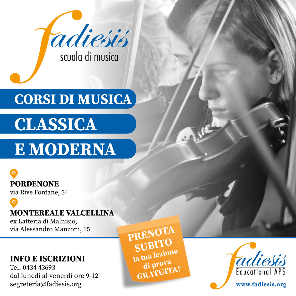 Seguite la nuova pagina dedicata alla Scuola di Musica Fadiesis per non perdere tutte le proposte e le novità! Tra corsi di strumento e di canto, coro, musica d’insieme e tanto altro ancora ci aspetta un anno ricco di musica![]()