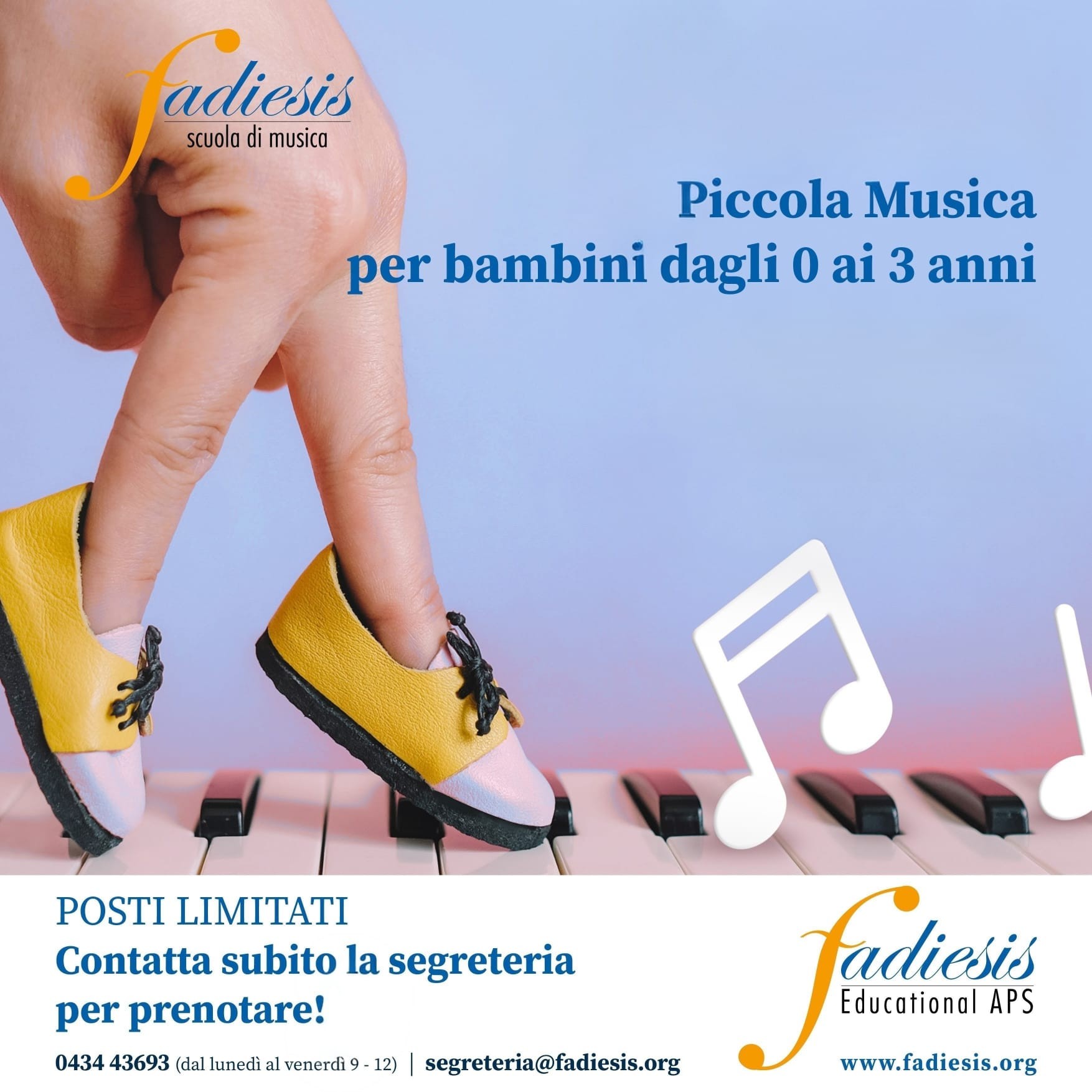 La Scuola di Musica Fadiesis propone un laboratorio di Piccola Musica per bambini dagli 0 ai 3 anni con la docente Alice Populin Redivo nella sede di Montereale Valcellina (via A. Manzoni, 15 – Ex Latteria di Malnisio).