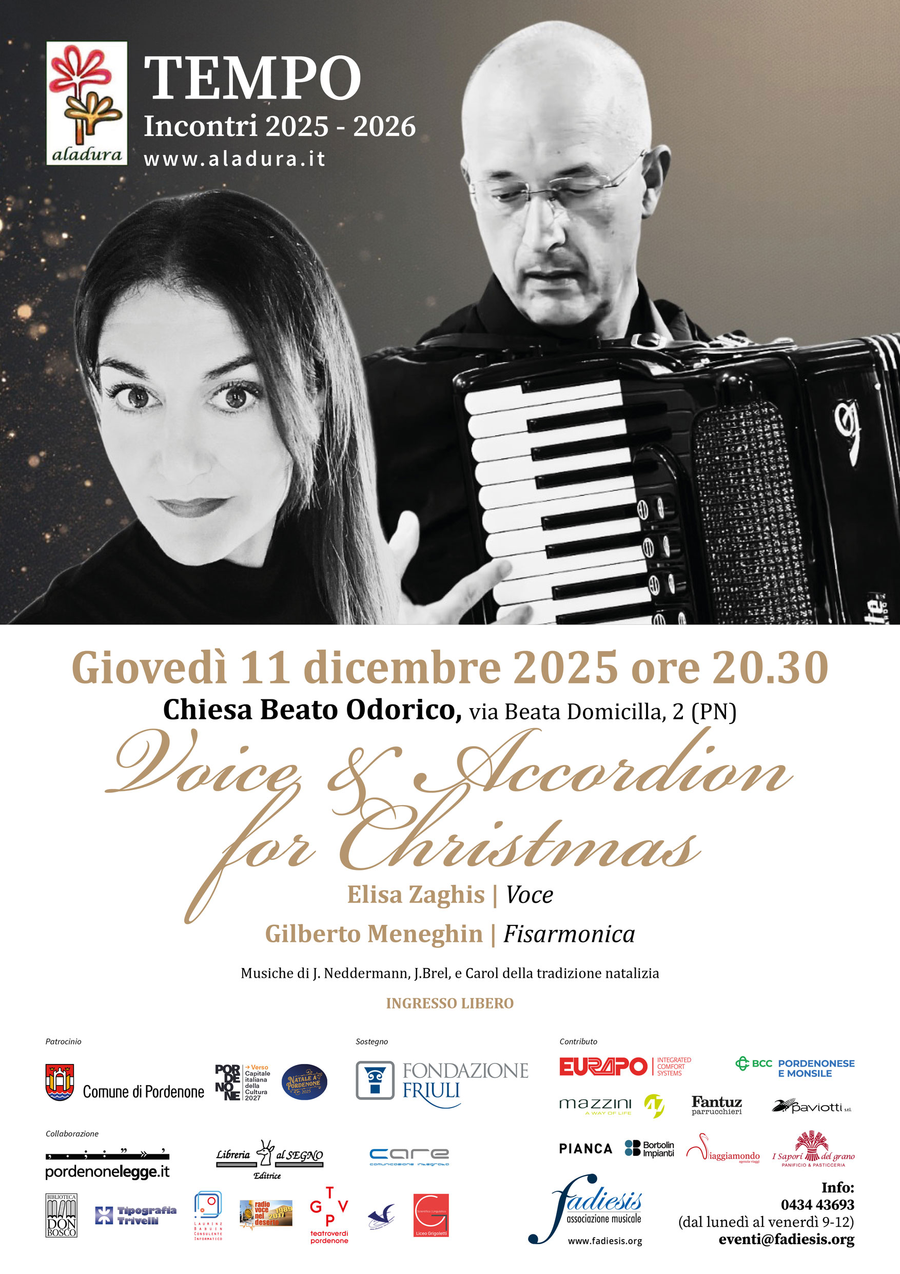 Sul palco la cantante Elisa Zaghis e il fisarmonicista Gilberto Meneghin per un appuntamento che, nella cornice di Natale a Pordenone 2025, permetterà al pubblico di immergersi nell’atmosfera incantata e festosa di questo magico periodo dell’anno grazie a musiche di J. Neddermann, J. Brel e Carol della tradizione natalizia.